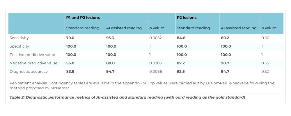 La lectura asistida por IA identificó lesiones P1 y P2 en el 73.7% de los pacientes, frente al 62.4% de la lectura estándar (superioridad estadística: p=0.0213).