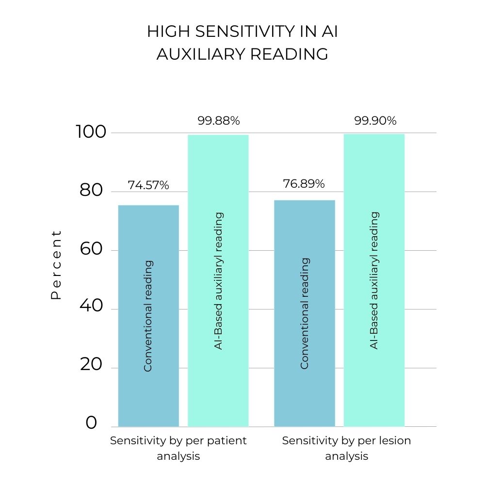 99.88% en el análisis por paciente y 99.90% en el análisis por lesión, comparado con el 74.57% y 76.89% de la lectura convencional por gastroenterólogos.